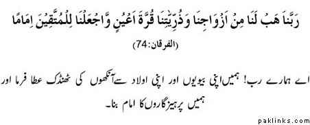 **O Our Lord! Bestow on us from our wives and our offspring the comfort of our eyes, and Make us leaders of the Muttaqun (the pious). (AL FURQAN: 74) **