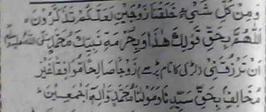Wa min kullay shai'in zowjaini La Allakum tazakkaruna .Allah Humma bi Haqqi qauwlika Haaza wa Bi Hurmati Nabbiyika Muhammadi Sallal Laahu Ta'ala Alayhi Wa Aalihi Wa Sallam an tarzuqani(name of the girl if the girl is not reciting for herself) zauwjan Saaliham Muwafiqan ghaira muhalifin bay haqqi Sayyidina wa Mauwlana Muhammadiwin' wa Aalyhi Ajmaeen.