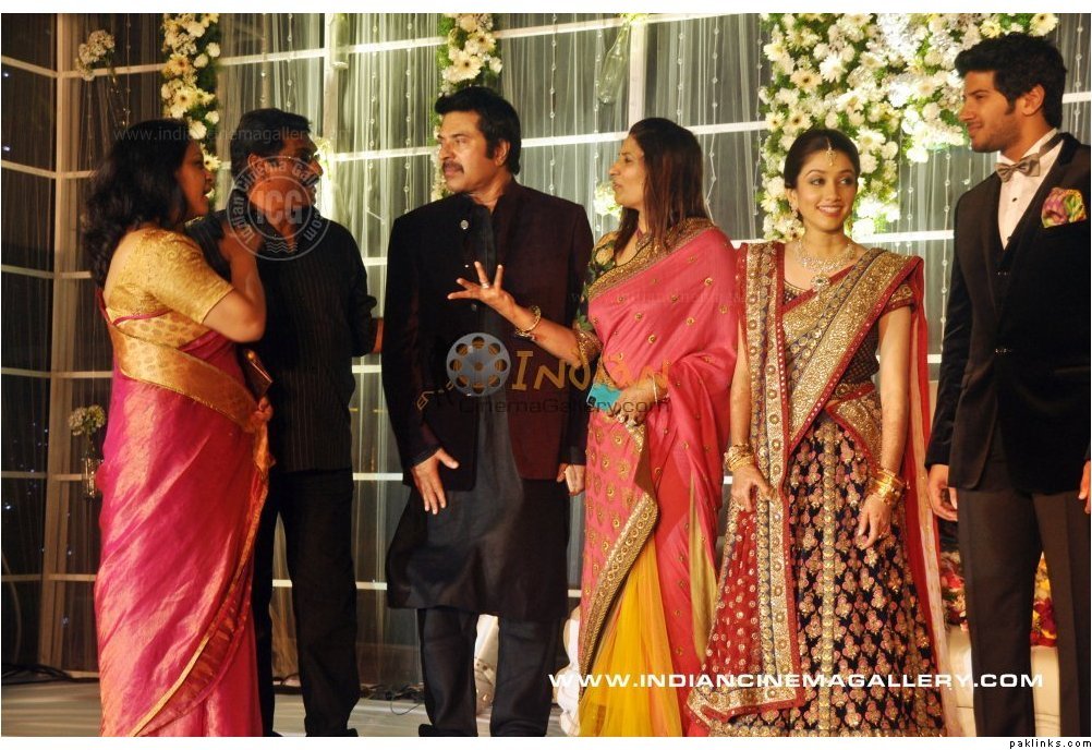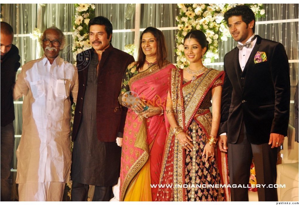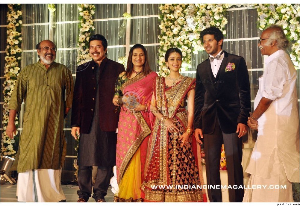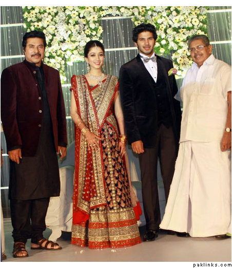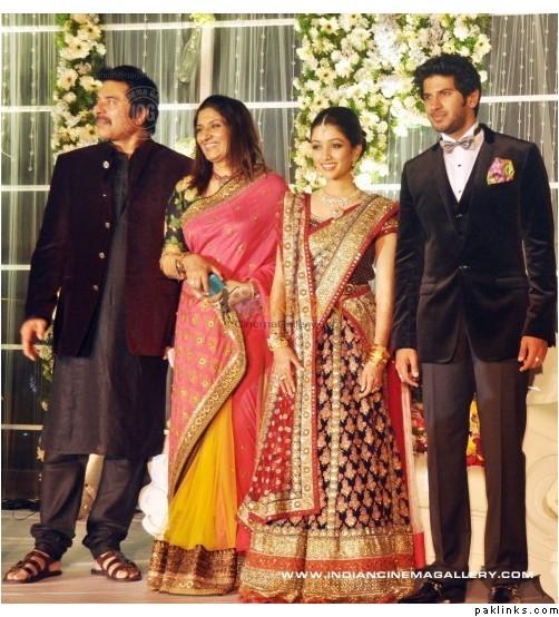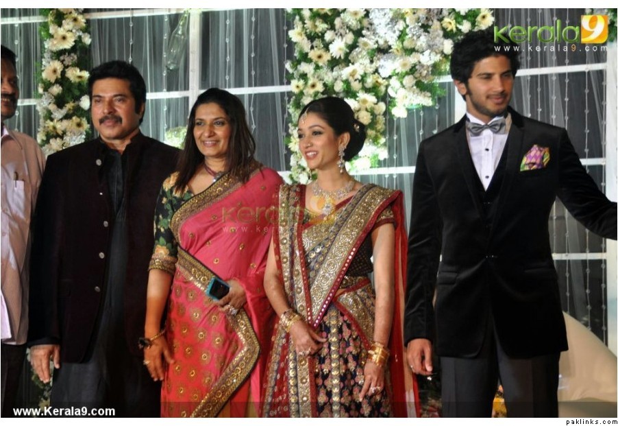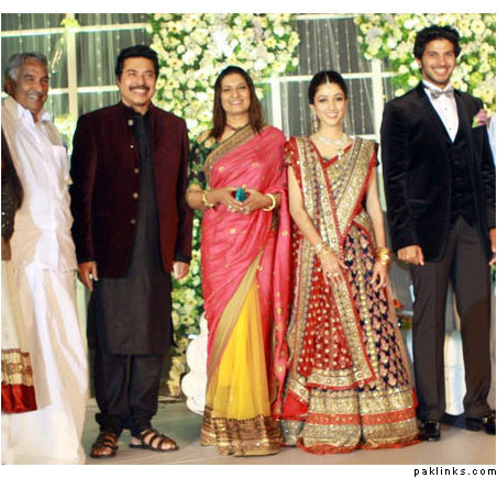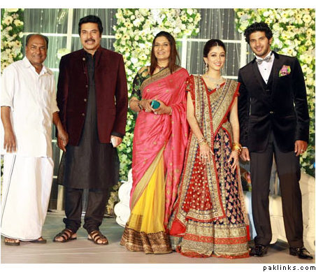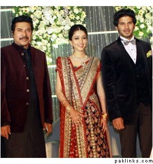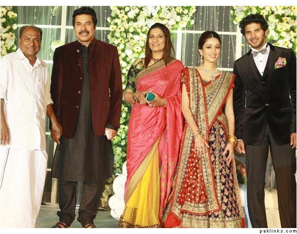 Mamootty and his wife Sulfath hosted a grand reception and invited their friends, relatives and colleagues from the film industry to Kochi Ramada resort on Monday, December 26, 2011. The groom wore a velvet suit and the bride wore a Sabyasachi lehenga. The groom's mother also wore a sari by the same designer.