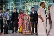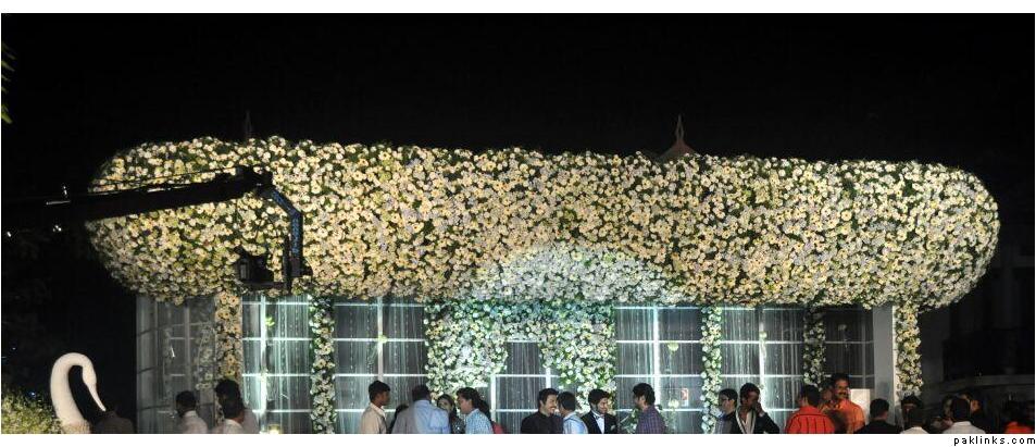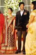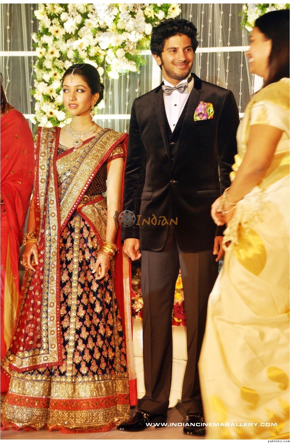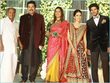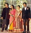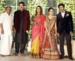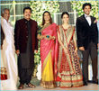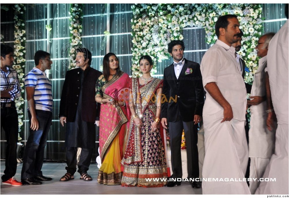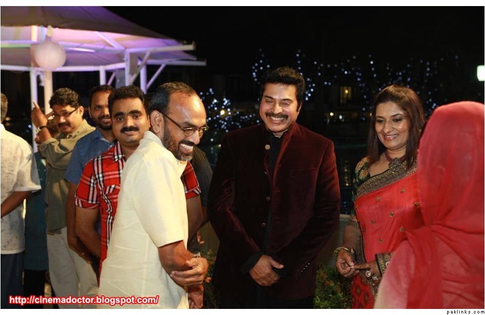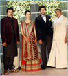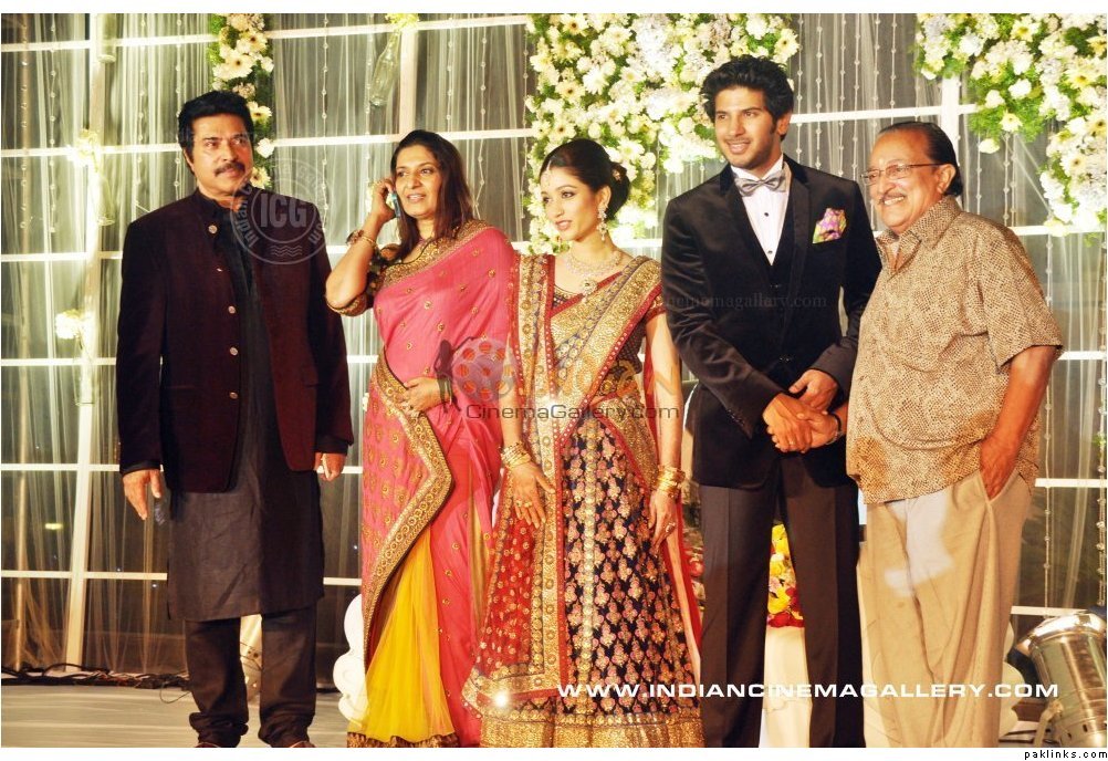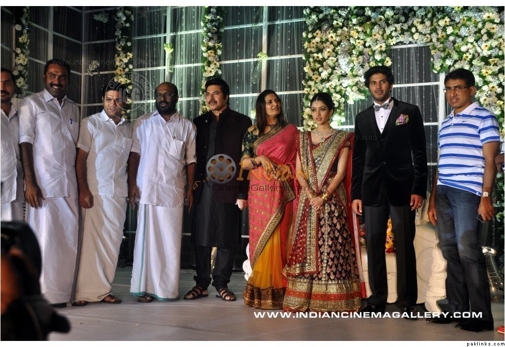 Mamootty and his wife Sulfath hosted a grand reception and invited their friends, relatives and colleagues from the film industry to Kochi Ramada resort on Monday, December 26, 2011. The groom wore a velvet suit and the bride wore a Sabyasachi lehenga. The groom's mother also wore a sari by the same designer.