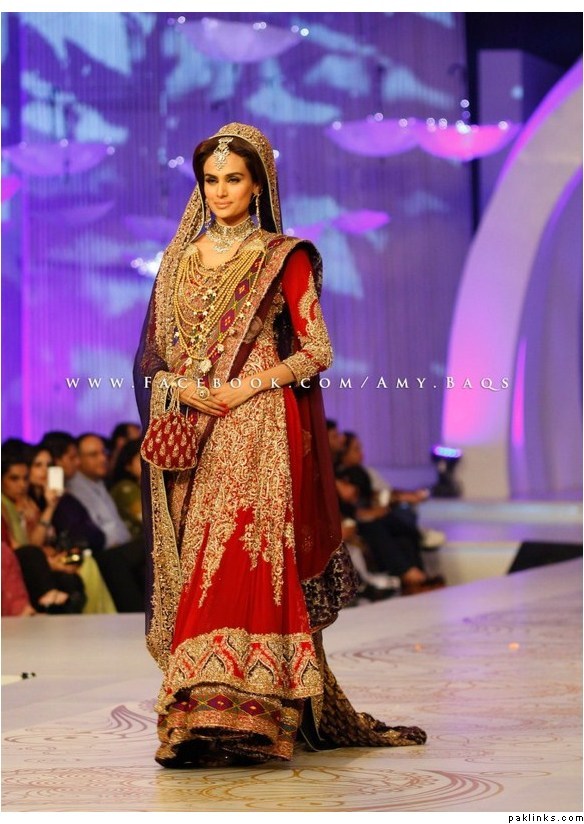 I'm not sure if this style is done in pakistan a lot, but it is quite common in parts of India where the bride would wear a saree. Zanib902 is right, the dupatta on the shoulder, which is more likely to be made of a heavier fabric, is shorter, and draped like a saree pallu. It's length wouldn't exceed your shins from either the back or front, and side would be pinned to the hip to show off the drape of the dupatta.