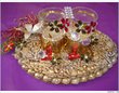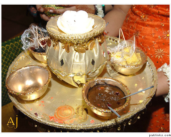 The main mehendi thaal. It is to be filled with sweets, oil, mehendi and 4 paan leaves decorated with “gota” to be placed on hand of the bride and the groom.