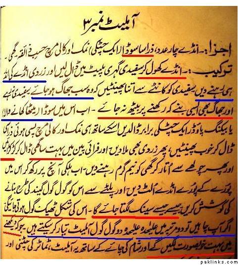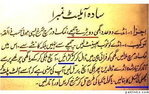 To conserve space and to keep our readership’s suspense intact I’ll share with you only 2 out of 11 egg recipes. The first one is titled: ‘Simple Omelet Number One’. Points to be noted are underlined in Urdu text below. Ingredients include 2 big spoons full of oil. To beat the egg into omelet, author is instructing us to use a fork instead of aspoon. She has also used a word ‘kaR-kaR-aayeN’ which I’ve never heard in Urdu before. It means the oil needs to be heated until it starts sounding like ‘kaR kaR aayeN aayeN’ or just ‘kaR kaR kaR kaR’. This is such a phoenitc invention of a word that I must say this book not only caters to ones stomach needs but also to linguistic thirst. In the last line author gives us a choice to make this omelet in the shape of afish by flip-flopping it continuously. Now this must be something special. I’ve never eaten an omelet shaped like a fish before. Enjoy