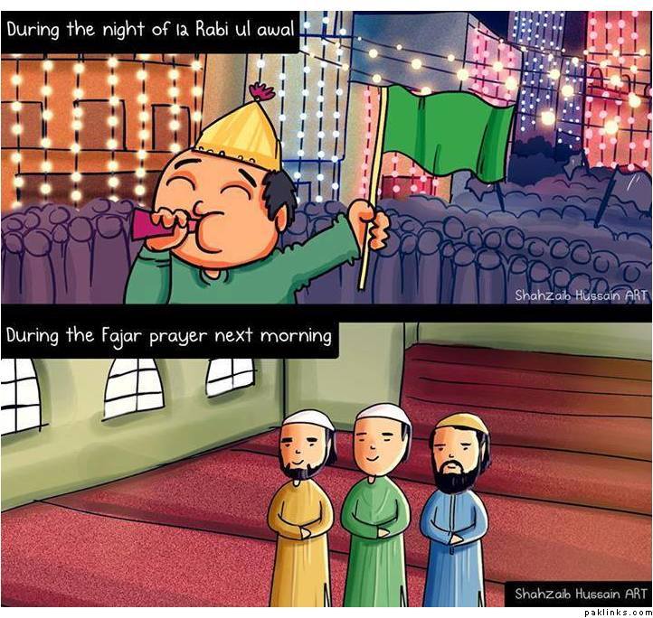 I’m in no position to call it bid ah but what probably started of as small has turned into pure Israaf. The painfully loud naats, the green everywhere, the “logo”, goodness all that electricity wasted on lighting, the huge rallies etc etc… It all feels so removed from the Essence of Islam.
