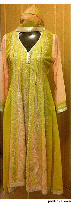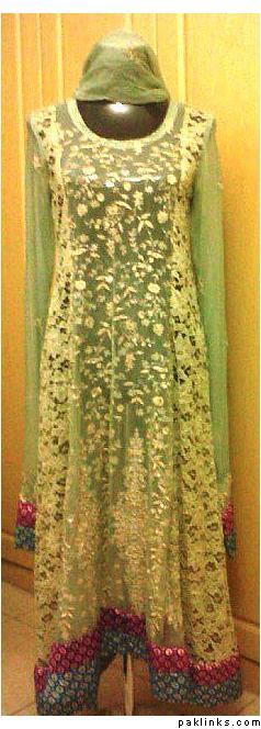the material is lace/net panels with full embroidery front and back on olive chiffon with jamawaar pattis on sleeves and daman