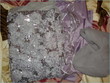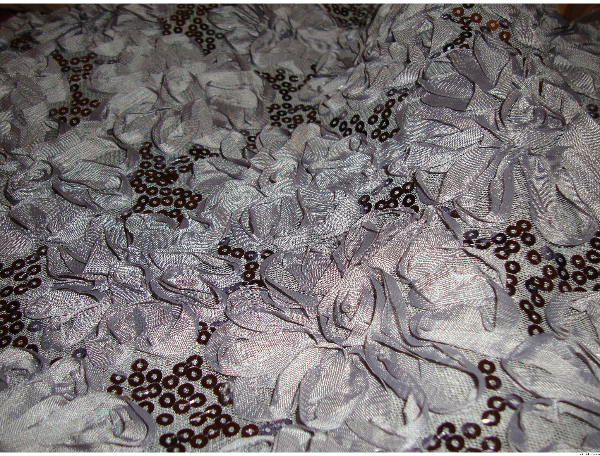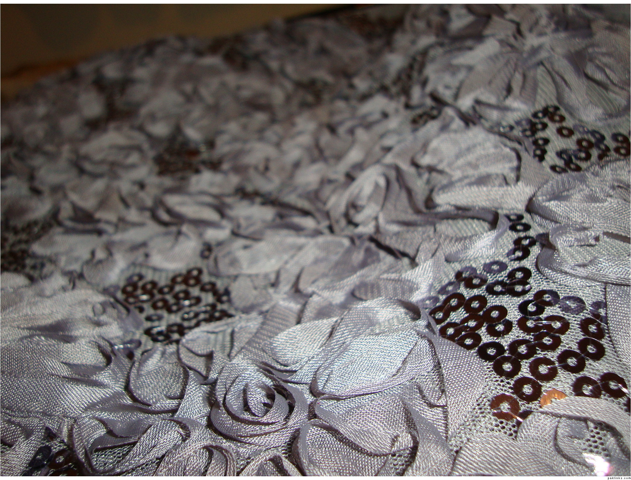 The flowery part will be the bodice, the crinkle chiffon will be the skirt and sleeves, the ribbon will possibly be sewn between bodice and skirt, the purple is the underlining. (the grey did NOT match)
