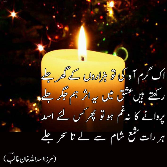 اک گرم آہ کی تو ہزاروں کے گھر جلے رکھتے ہیں عشق میں یہ اثر ہم جگر جلے پروانے کا نہ غم ہو تو پھر کس لئے اسد ہر رات شمع شام سے لے تا سحر جلے (غالب)