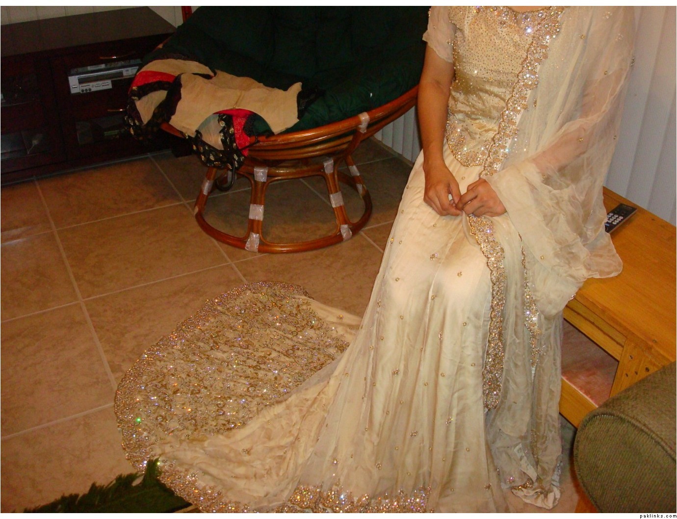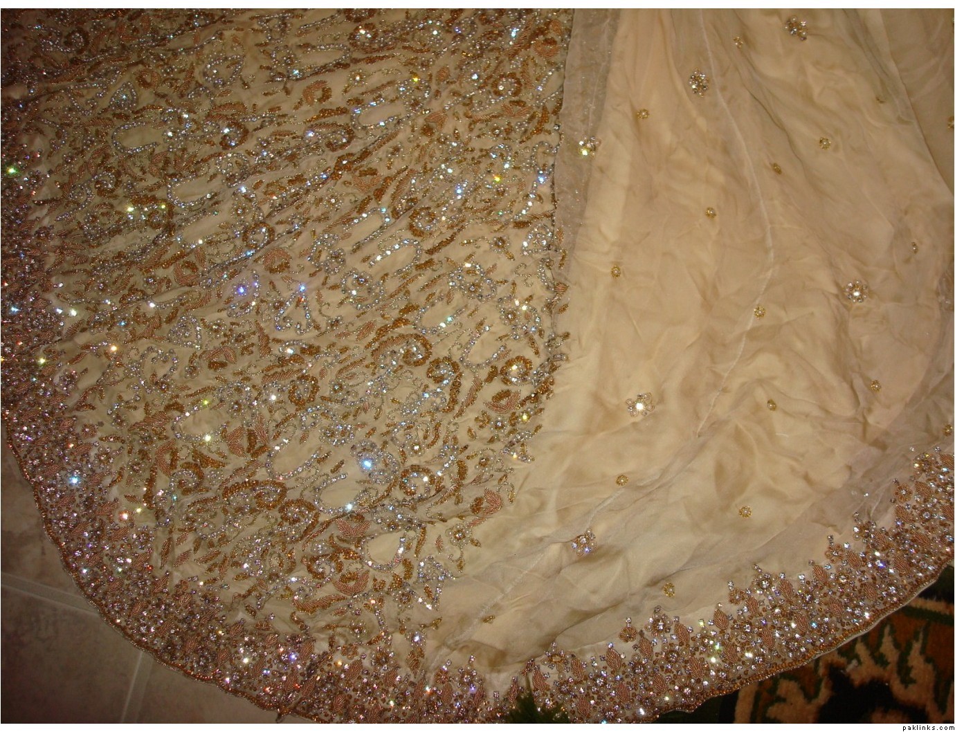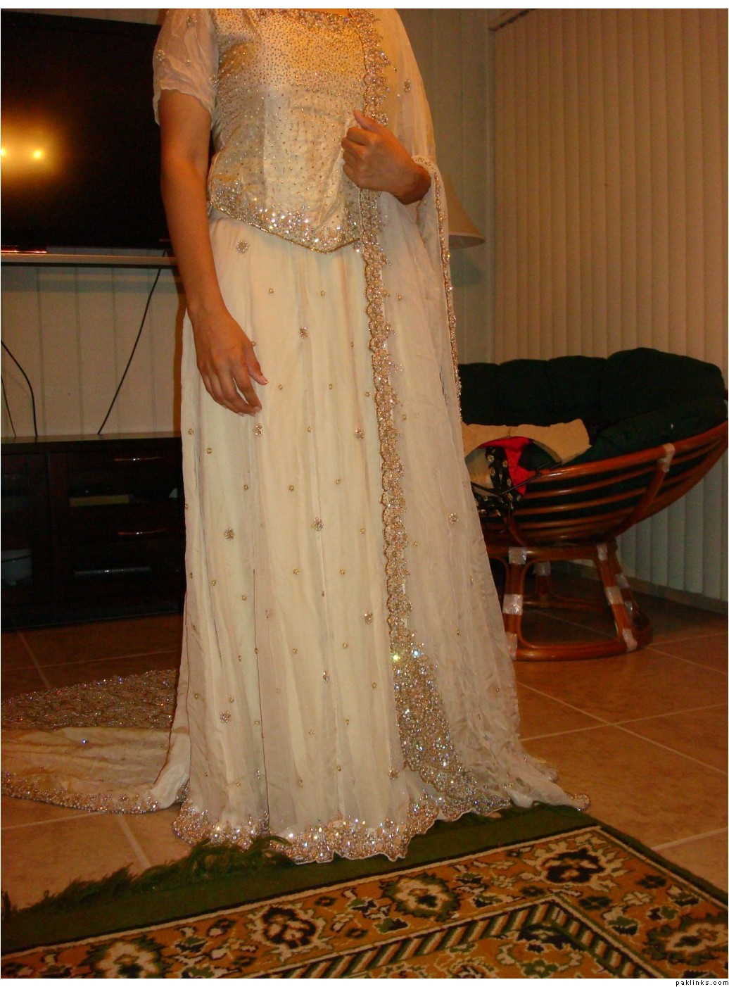I have a beautiful bridal dress for sale ! It was made for a customer who ordered it because she hated an ugly dress her MIL got for her for walima but when I made it and sent to her, she withdrew her WU payment and disappeared with the dress,refused to attend my phone till her wedding and wore the dress her mil got her due to family pressures ! She said she wanted me to refund her advance payment which was 4-5k only because rest of it got adjusted in what she ordered for her mom. Anyways, after threats from me about legal action (i had her emails of order and her satisfaction on what I made plus slip from WU that showed she submitted the money,gave me the mtcn code and withdrew the money few hours later after i sent the parcel and all was in my favour but i didnt have anyone to follow the case) she sent the dress to one of my friends in houston few days back. My friend modelled the dress for me so I can try selling it online.JazakaAllah to her. Anyways, this ‘story’ is just to remove any doubts about the lehnga not being brand new and I am not selling a defective piece ! here are the pictures: