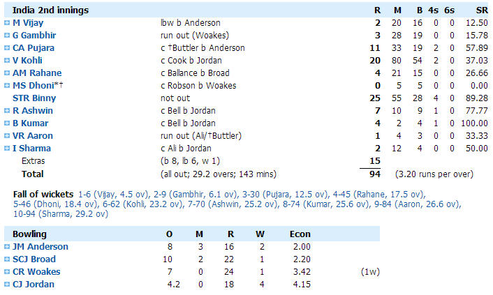 12.50 pm India's top-order has simply refused to raise their game while England's seamers have only looked like they're getting better. We will take an early lunch and the visitors will be fuming from losing one of their batsmen to a needless run out right on the stroke of the weather souring and rain coming down.