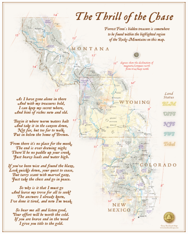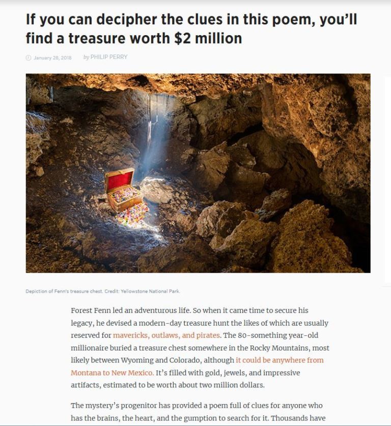 The mystery?s progenitor has provided a poem full of clues for anyone who has the brains, the heart, and the gumption to search for it. Thousands have tried and two have died, as clues?which look simple on the surface, quickly grow maddeningly difficult to decipher.Fenn, now 87, was a fighter pilot during the Vietnam War. Afterward, he became an amateur archeologist, self-taught, and set up a shop selling artifacts in Santa Fe, New Mexico.