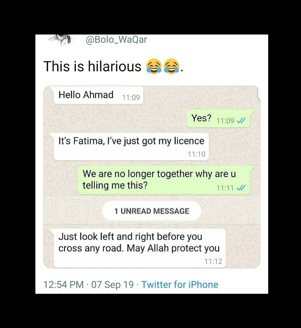 The Ex GF is now warning the Guy that she has not got the driving licence … He should be careful when walking around on the road … she will plan to hit him