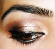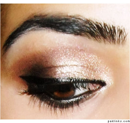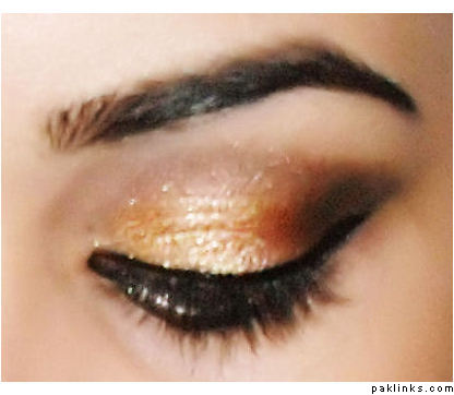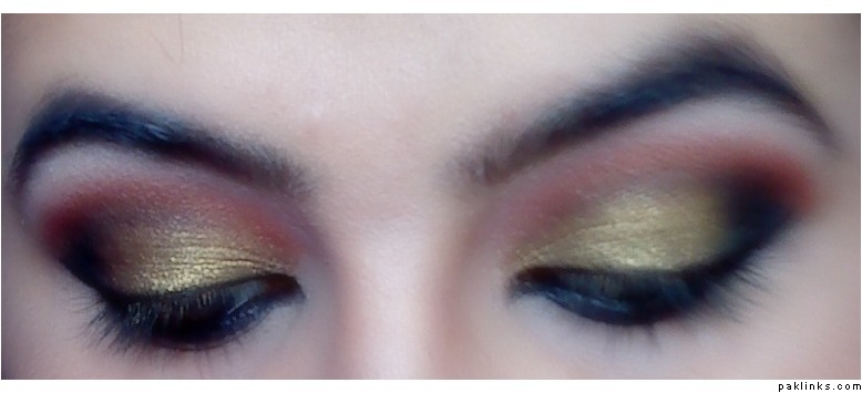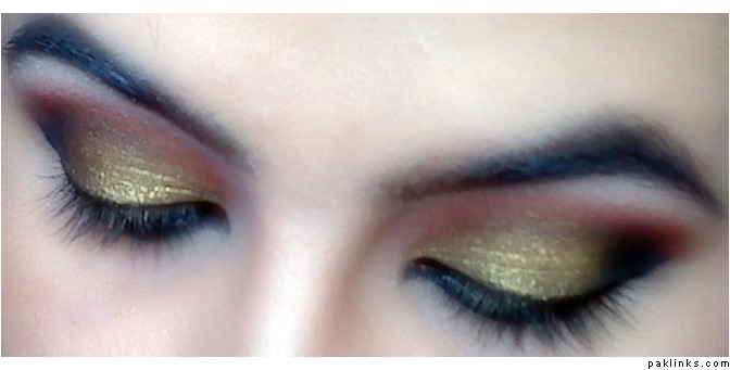 Mac's amber lights eyeshadow on 3/4th of the lid. Since I didn't have a gold/bronze pigment, I had to apply a thin layer of a cheap gold dust thing I bought from Pakistan over the amber lights to achieve the desired gold/bronze colour.