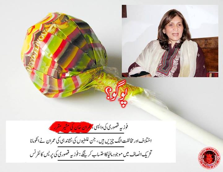 I read on fb : Fauzia Kasuri is back in PTI. IK agreed and tomorrow, she will join as Advisor to the Chairman for overseas & gender empowerment.