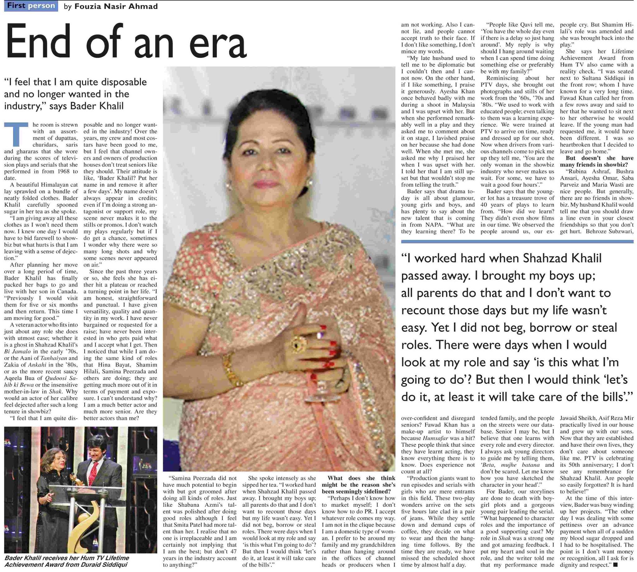 though everyone has to leave at a certain time but jis tarhan se ek legend ne industry ke logo ke behavior se attitude se new actors ke disrespectful behavior se bilbardashta ho kr yeh decision liya hai yeh bohot dukh ki baat hai yeh is field ki bohot gandi haqeeqat hai ke yahan sab matlabi hai aur jab matlab nikal gaya to palat kr poochtay bhi nahi hain aaj in ke industry ko chorne ke baad media ke log drama industry kr log bohot sympathy dikha rahay hain lekin yeh wahi sab log hain jo is behis field ka hissa hai Showbiz main kisi ke liye bhala krna namumkin sab apna fayda dekhte hain aur dosre ko istemal aur legends ki khidmat ki to koi importance hi nahi !