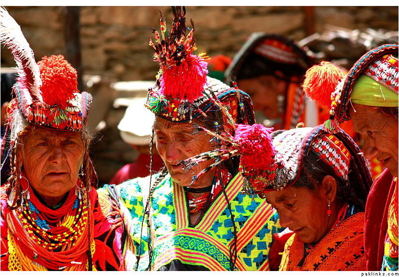 Description: Elderly Kalash women in Pakistan wearing traditional headdresses