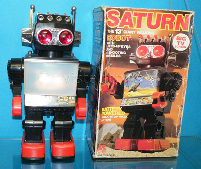 Saturn The 13" Giant Walking Robot is one cool battery powered Robot. When batteries are inserted his eyes flash, the robot walks, stops, and then a space scene scrolls across his TV screen. He also shoots missiles which are sadly missing. Saturn comes in good played with condition and boxed, as seen in the photos. The box is in fair condition considering its age with edge wear, creases and bending as shown.