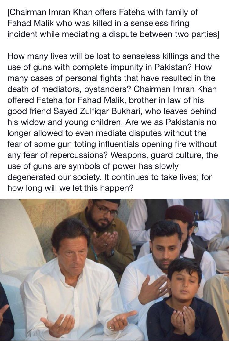 **PTI @PTIofficial****Chairman offers Fateha with Fahad Maliks family who ws killed in senseless firing incident while mediating a dispute **
