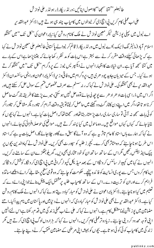 PM of Pakistan Yousaf Raza Gilani will give medal to Ali Moeen Nawazish on 23rd of March,2009 on his outstanding performance.