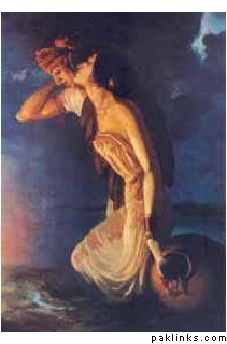 What shall she do now? Abandon the trip and go back or continue trying to swim without the pitcher and drown? Her inner struggle at this point - her fear of not being able to make the trip and thus not living up to the test of true love, her hope of making it, somehow, with the help of the pitcher - are best expressed in the song made memorable by Pathana Khan in his inimitable voice: *Sohni gharray nu aakhdi aj mainu yaar mila gharrya.