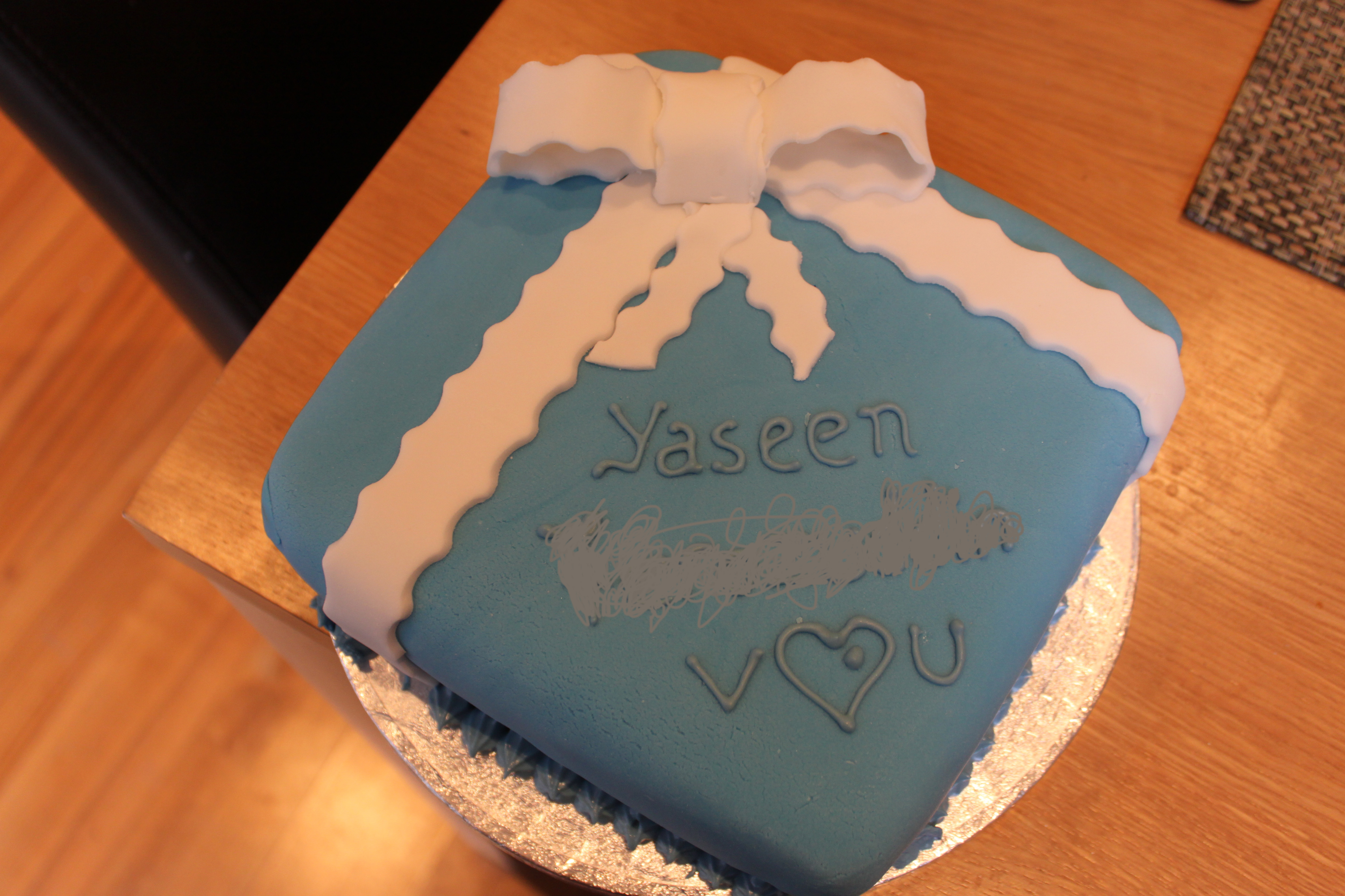 I had HUGE probs with the fondant - I bought a book from Amazon and its called international school of cake decorating and followed a receipe from there for the fondant. It consisted of 870g of icing sugar, 2 tbs of lemon juice, 2 tbs of water and white butter. Heat the lemon juice with water and butter and add 2 cups of sugar. Mix thoroughly and take it off the heat and slowly add the sugar while mixing it. Had a hard time mixing it as it was getting stiffer and stiffer. I think i added all the sugar and it become very very dry and VERY crumbly. At this point i was feeling guilty that i have wasted so much stuff so heated the whole thing again in a big pot until it was slightly gloopy and added 2 tbs of glucose (just thought it might help) - then took it off the heat again and added more sugar and kneading hard. Well in the end i gave up as it was getting crumbly again! So the blue icing you see here is actually shop bought!