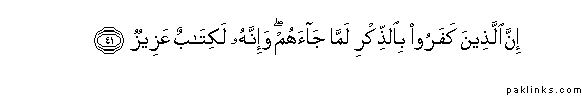 Indeed, those who disbelieve in the message after it has come to them. And indeed, it is a mighty Book.