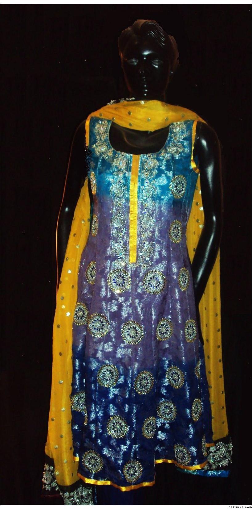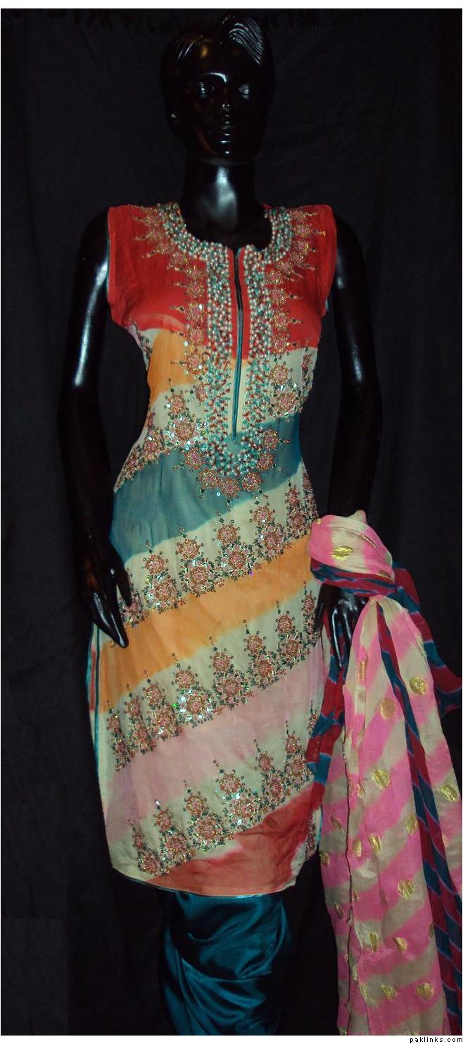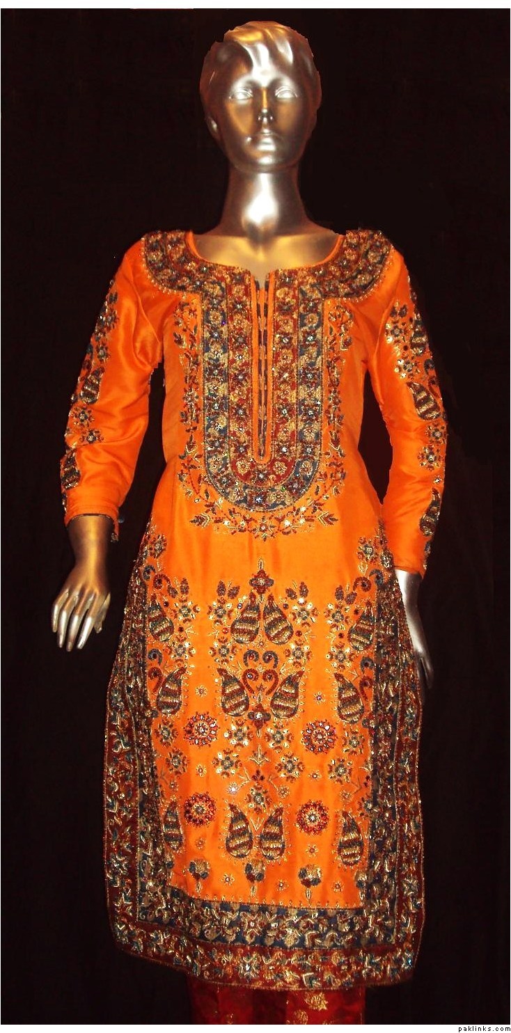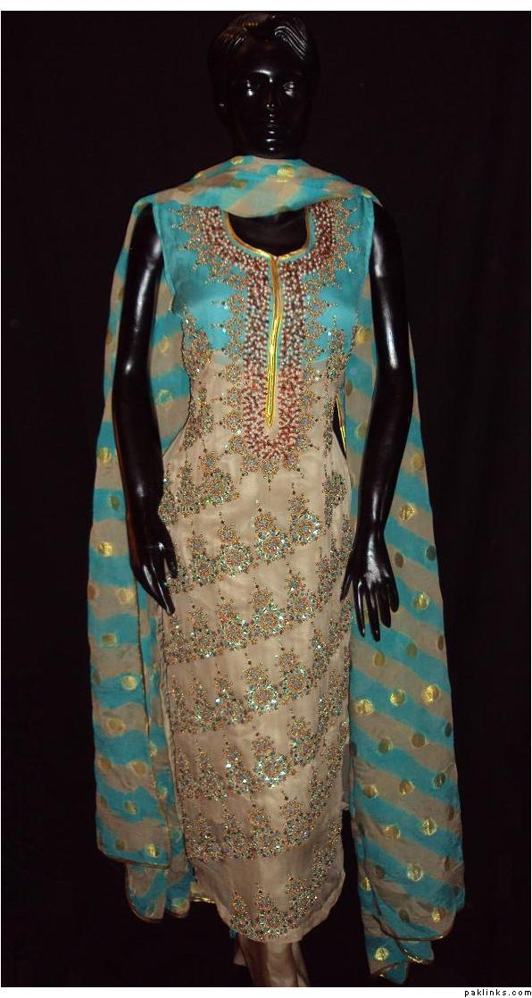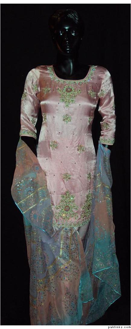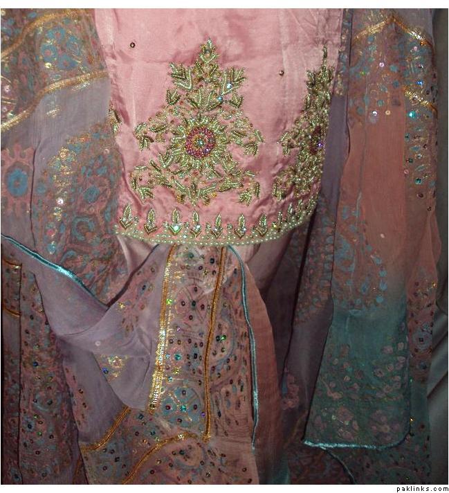 The dress you asked about, the shirt is chiffon, dupatta is banarsi chiffon and bottom is charmeuse. Embroidery includes, tilla, sequins, beads, kora, zero size gota, pearls, crystals, cut pipes and add ons. The outfit is all handwork.. no threadwork/machine whatsoever. It's $280