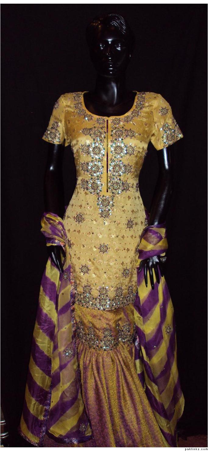 Mehndi gharara, banarsi shirt, chiffon dupatta and jamawar bottom. Embellished with gota, kora, beads, sequins, cut pipes, crystals and many add ons.