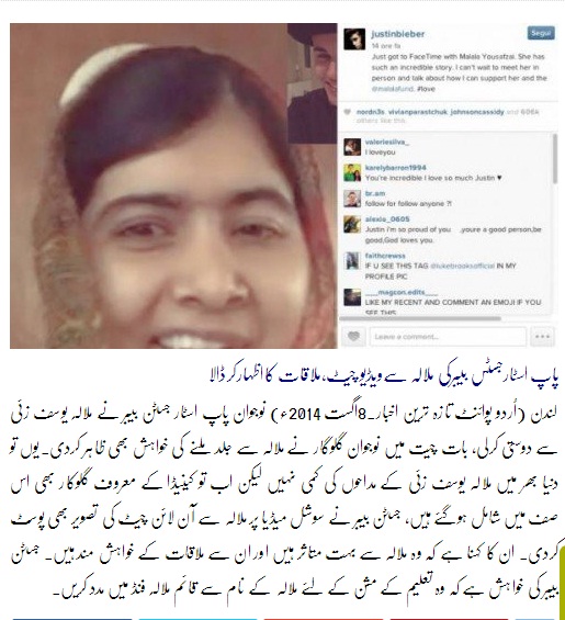 Justin Bieber had a video chat on his phone with Malala. He expressed his eagerness to meet her to help support her charity. No biggie. It’s not as if Bieber and Malala have become best buddies or something.