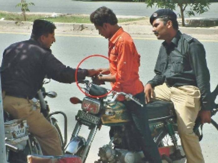 One policeman is sitting on the poor guy's bike...and maybe the money they'd be earning from him could be his full day's earning...
