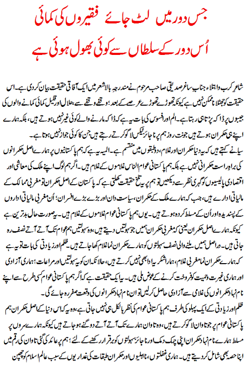 I"m 101% agree with this column :k: Yah hamaray tukroon tukroon par palnay wallay hamaray hukmaran hum he par bhoonktay hain
