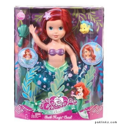my 4 yr old bought this bathtime princess ariel recently and she loves it, it changes hair colour with water and floats with the little flotation ring included. comes with a little brush and a baby flounder, very cute. what i like best is that it doesn’t have those weird barbie curves, so its not inappropraite for a 4-5 yr old.