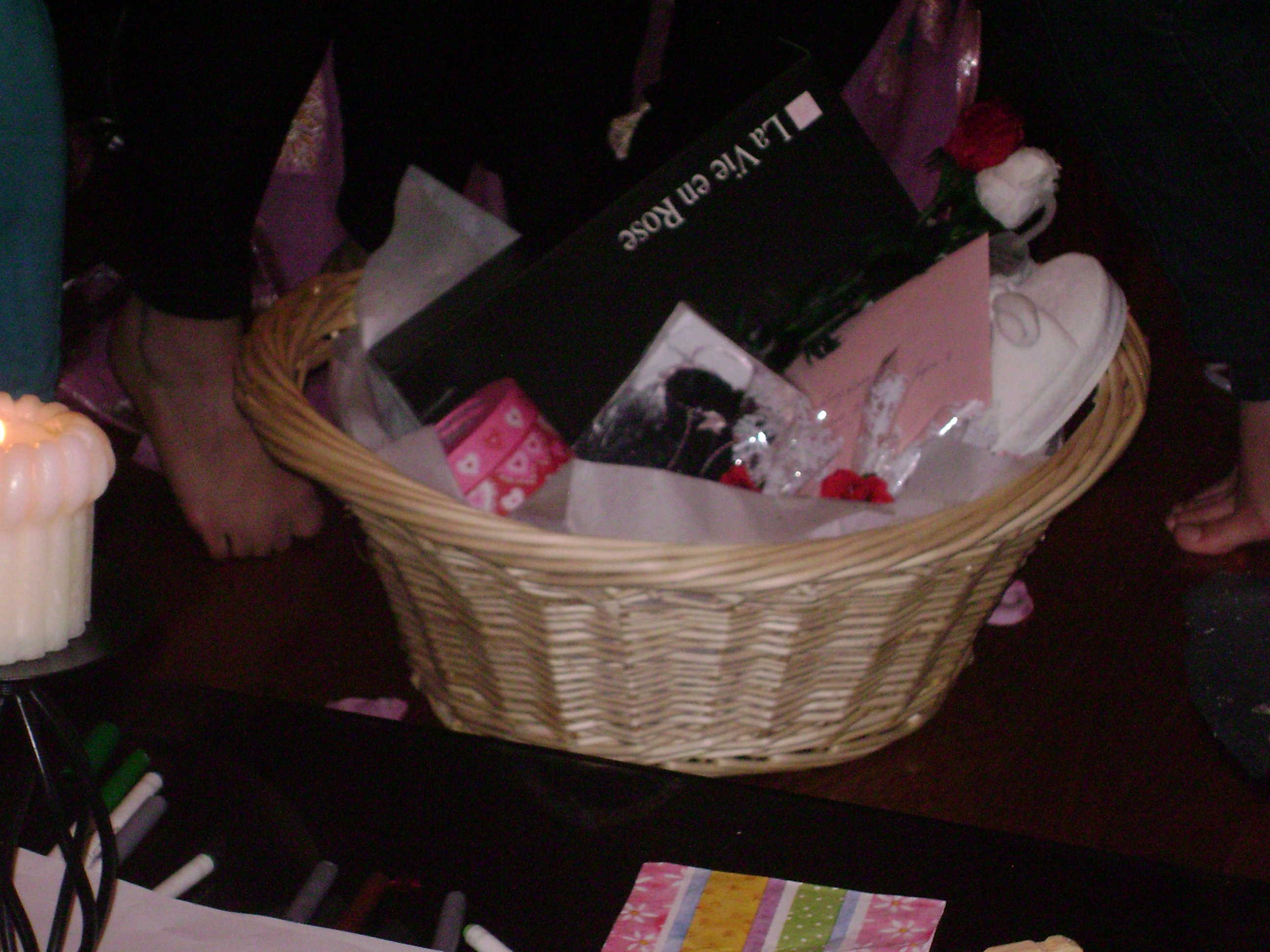 like in mine they got a really nice lingere and they put pills for stress (which is suppose to be a joke- i think its like candy or something) slippers, bath items, candels, fake roses…put other things that she will like…where do u live maybe i can help u according to that…heres a picture of what it looked like