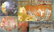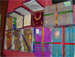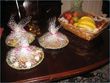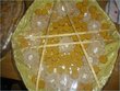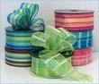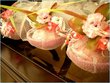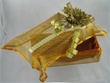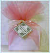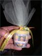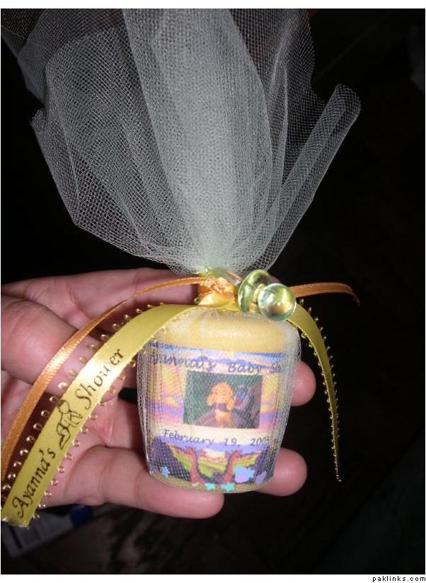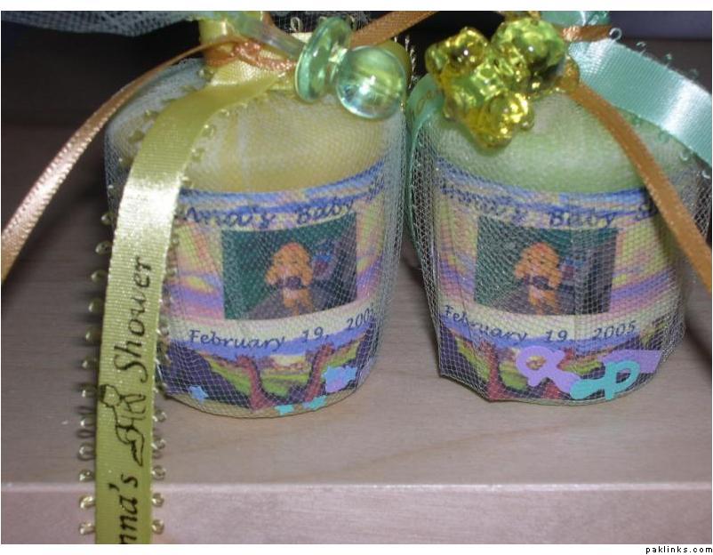 Yellow & Green candles with a touch of Orange wrapped in gauze/net fabric tied with yellow, green and orange ribbons. Confetti placed inside.