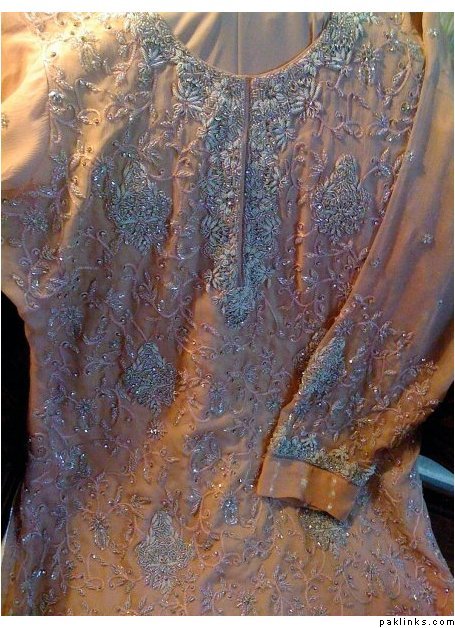 Peach Princess sent to Reality_Check - the sleeves have been finished with pure chiffaun jamavar, the whole suit is finished with silver piping, fully lined.