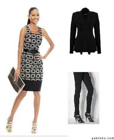 this is the one I’m really liking for now! A black and white dress with leggings or trouser (most likely trousers or jeans) and high heels..