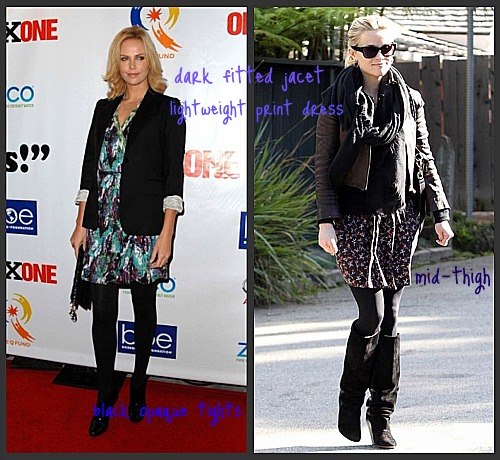 Midi dresses are in right now, so you'll find lots of options. Should be fine with black tights and heels. There are lots on asos, order a bunch on next day delivery. You can send them back if you don't like any. Or something like pleated palazzo pants and a cute top.