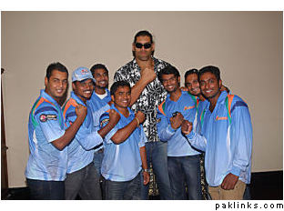 Those of you who’ve grown out of the entertainment-wrestling phase might need an introduction to the Great Khali. He’s a 7’2" wrestler, who once went by the name of Dalip Singh Rana and now trades punches with the likes of John Cena and the Undertaker. He recently visited India and managed to meet one of his idols, who’s considerably shorter at 5’5" - Sachin Tendulkar. A bit of a shame, then, that there isn’t a picture of the two of them together. Several ICL players, however, did manage a photo opportunity with Khali.