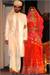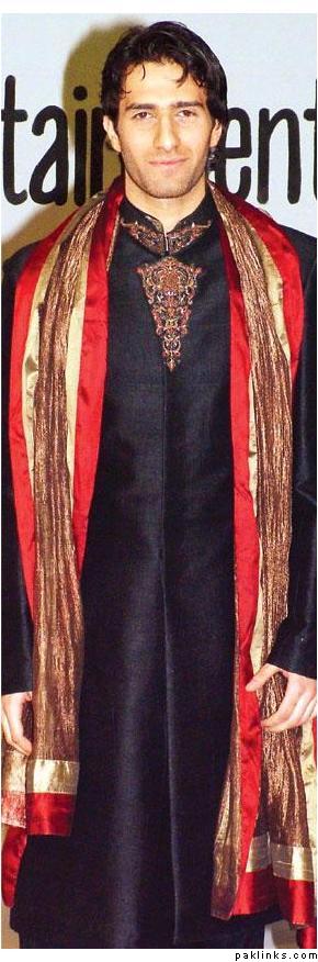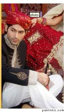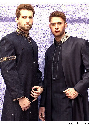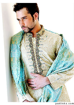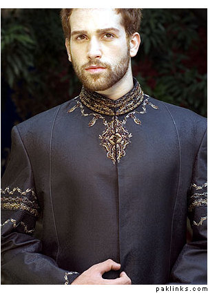 My husband wore a very dark green (almost black) jamevaar sherwani from Amir Adnan (it’s no longer on their website – this is from Dec 2004). He still looks gorgeous in it :love:.