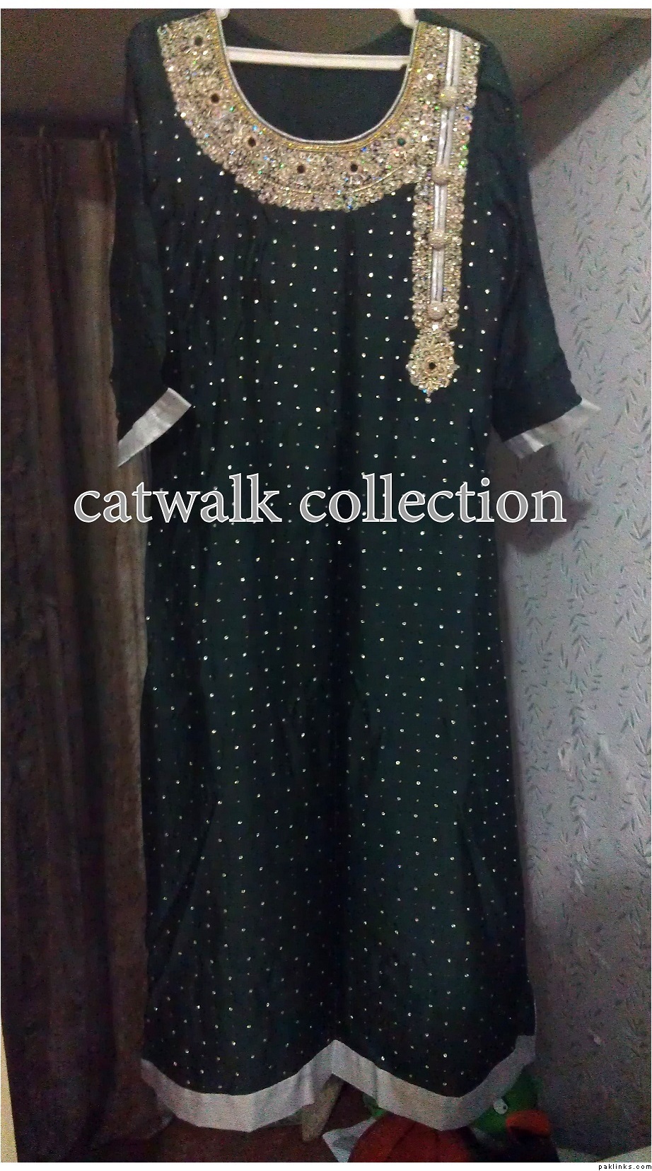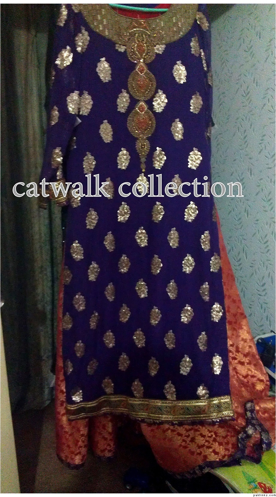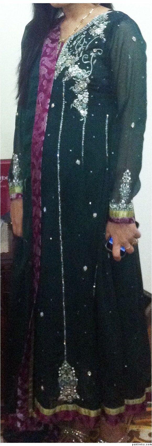 Floor length shirt, 56" , flair 150", pure chiffon shirt and duppatta. Two toned beautiful dress. With pitta, sequins and diamanté , pure jamavar pattis at the bottom of the shirt. Pure silk pants. Size medium.