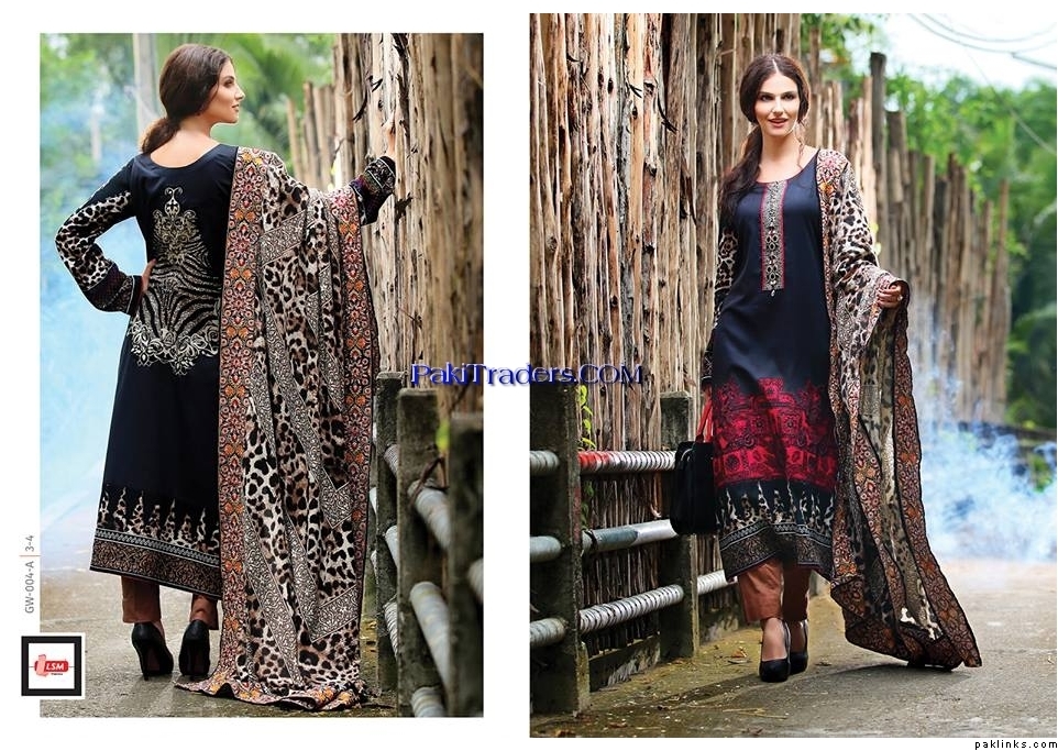 this suit is for sale for a price of PKR 7200 with free shipping in UK. This beautiful black suit with tiger printed embroidered shawl by LSM Gorgeous wintery collection 2014