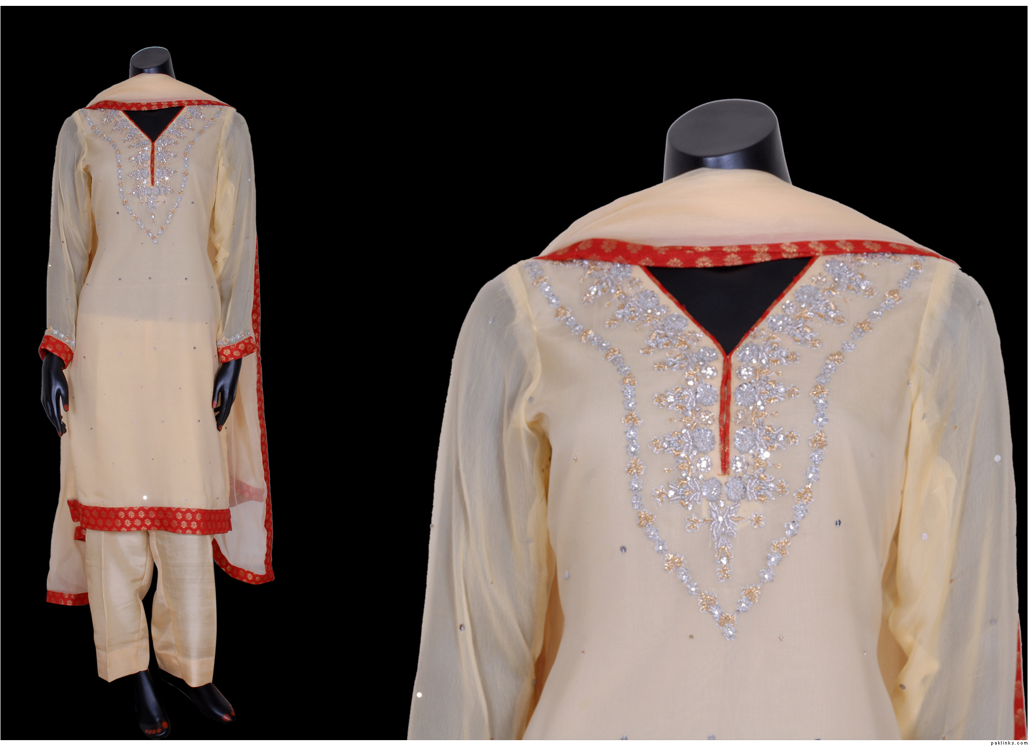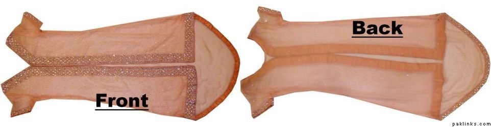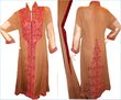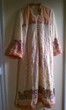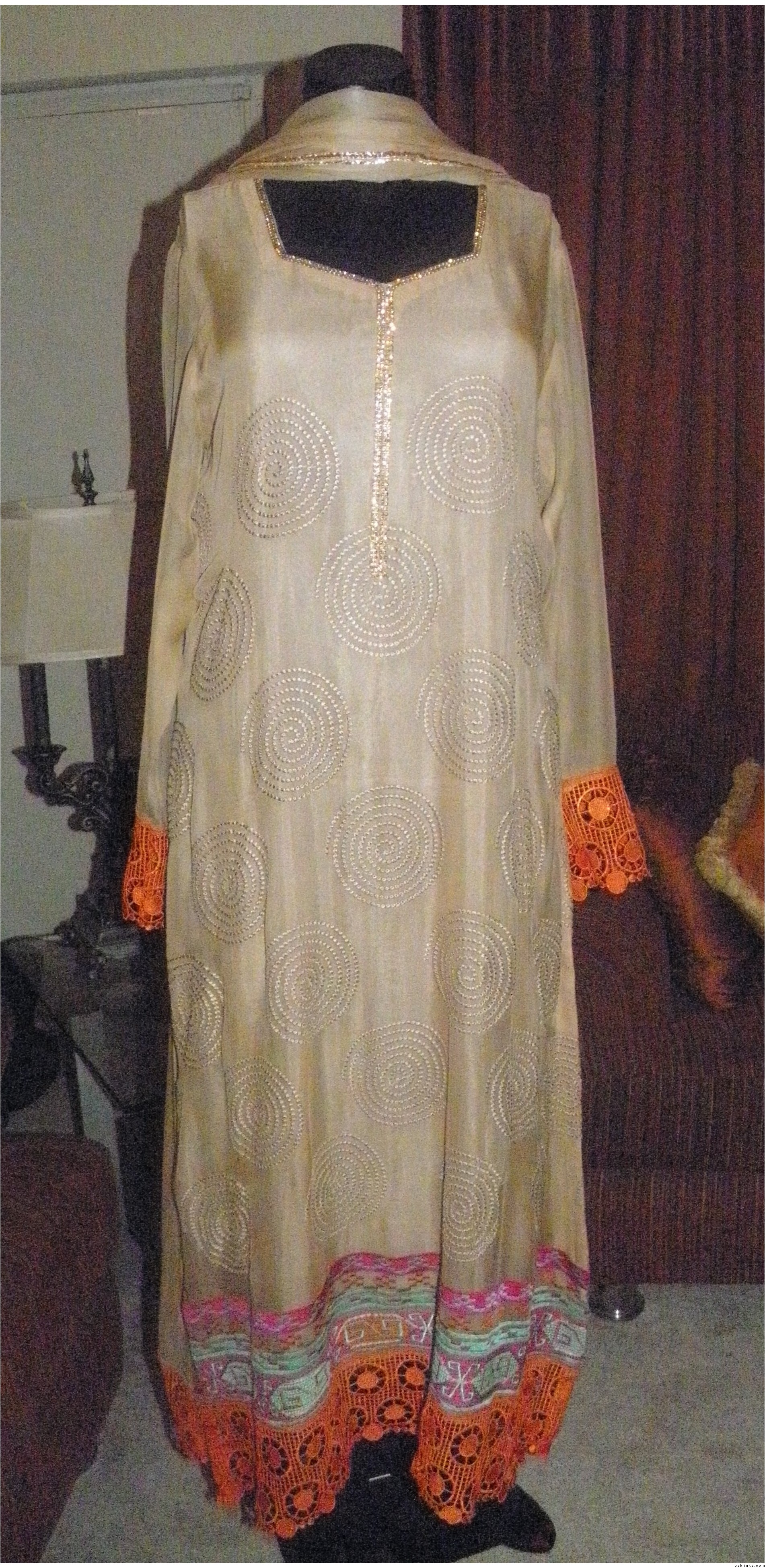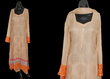 Cream pure chiffon with pink n violet flowers embroidery, cream embroidery and sequins all over front. Peach velvet and banarasi details. 51" length. Chest 22" (large) Dupatta has spray of embroidery flowers and sequins, with peach banarasi trim. Completely lined shirt (full sleeve lining too). Cream churidaar. Needs complete overlocking on all inside seams, unless you want to wear it only once!. $70 or nearest offer. Never worn, brand new! pm me if interested.