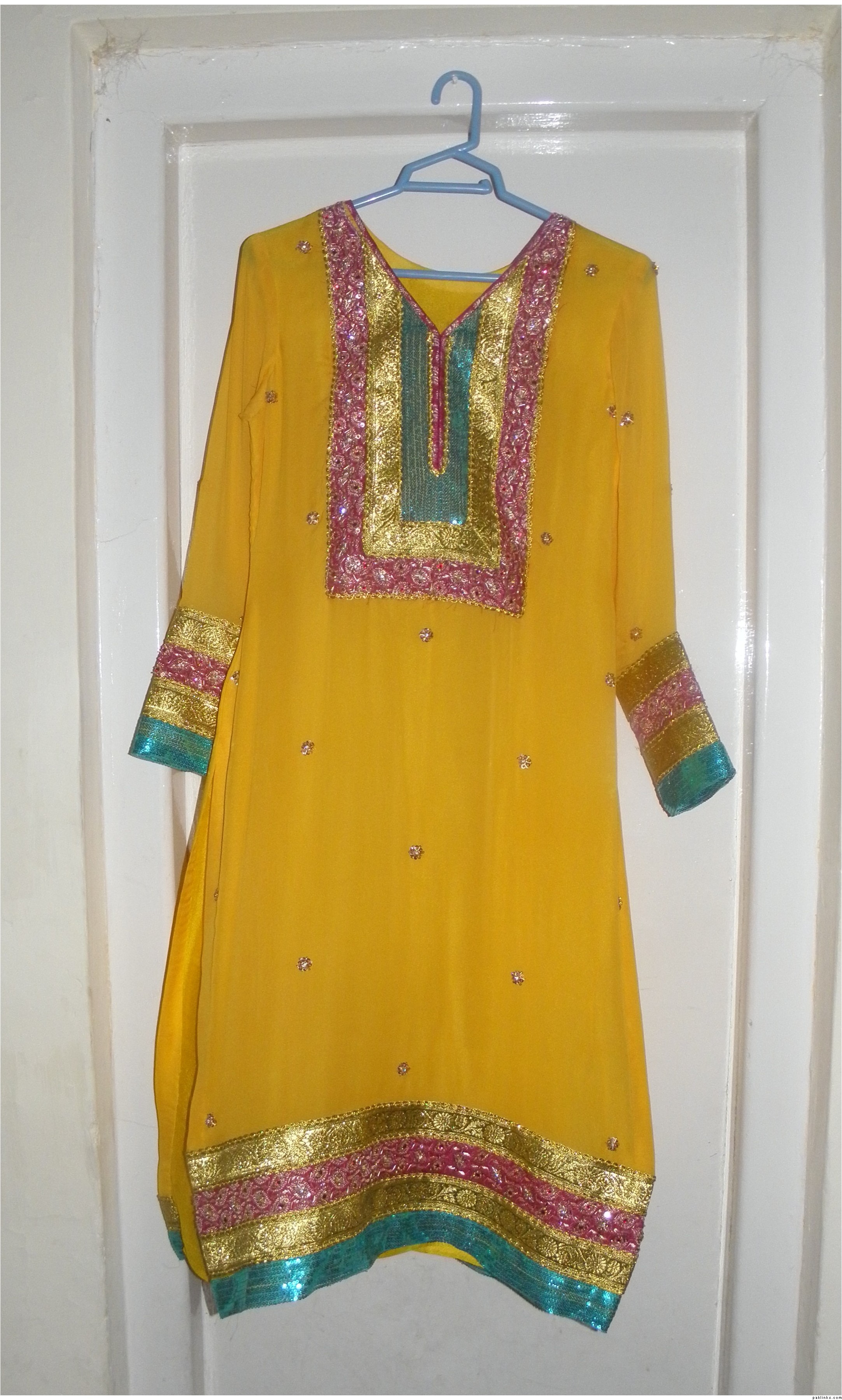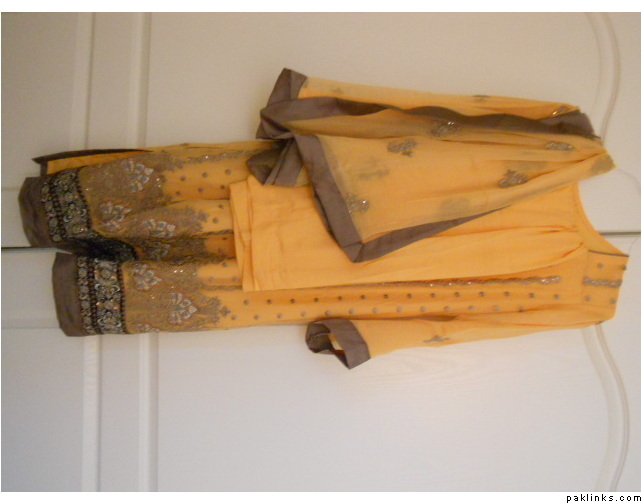 Heavy formal for sale. Perfect for Eid/weddings/functions. All pure fabric except for the lining. Comes with pure silk pants + plain chiffon sharara. Size: M-L, Price:$350 + shipping from the U.S.