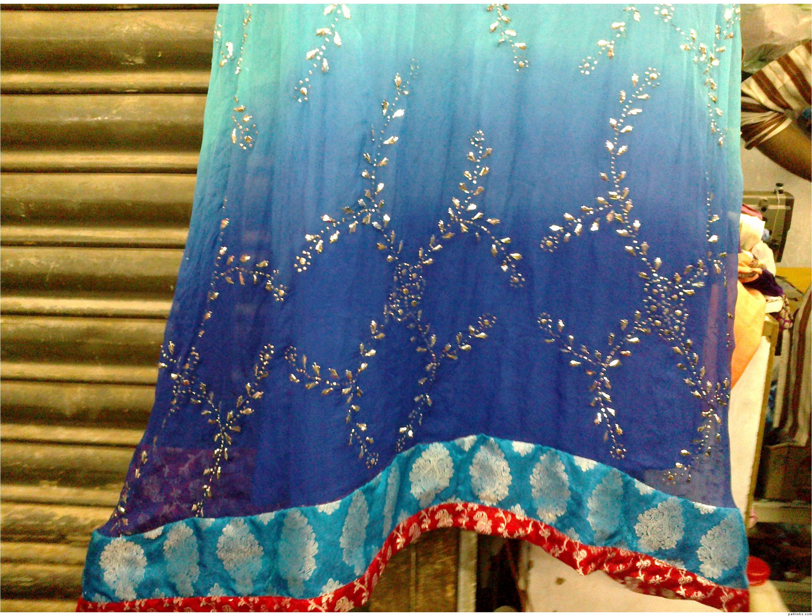 Photo taken from a mobile phone, so pardon the quality. The fabrics used are fully pure, and the outfit has high end zardosi work on the neckline, with a kamdani jaal all over. The shaded bit is a lot more gradual than it shows here as well. The dupatta is also shaded in crushed silk. Will upload better photos in a couple of days if it doesnt get sold:)