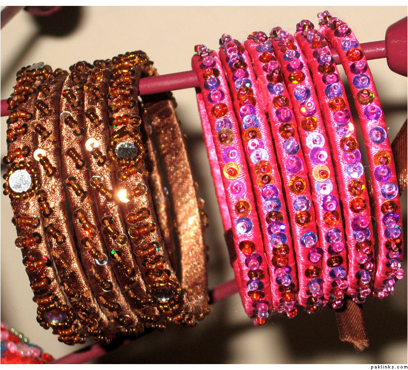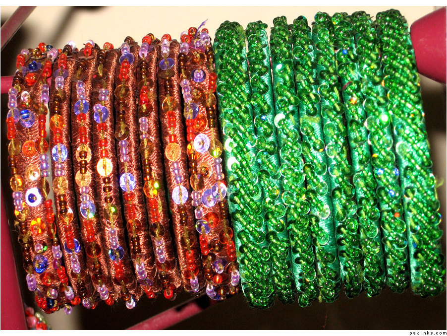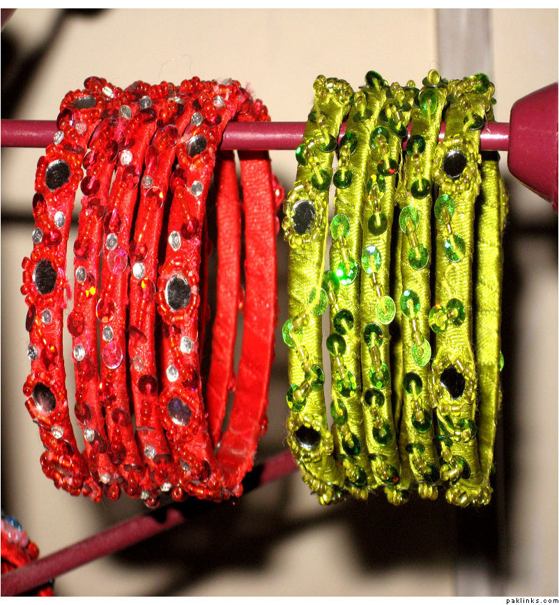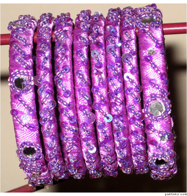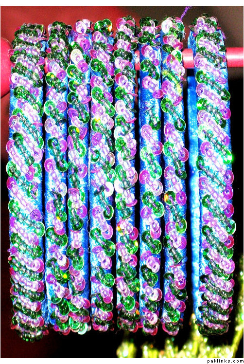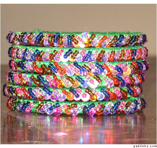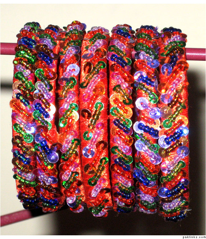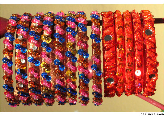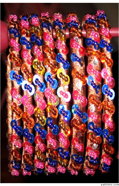 Material used in these bangles are ribbon, motti sittara, sheesha, kora and small size nug ..