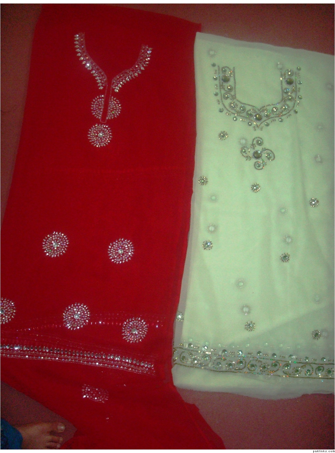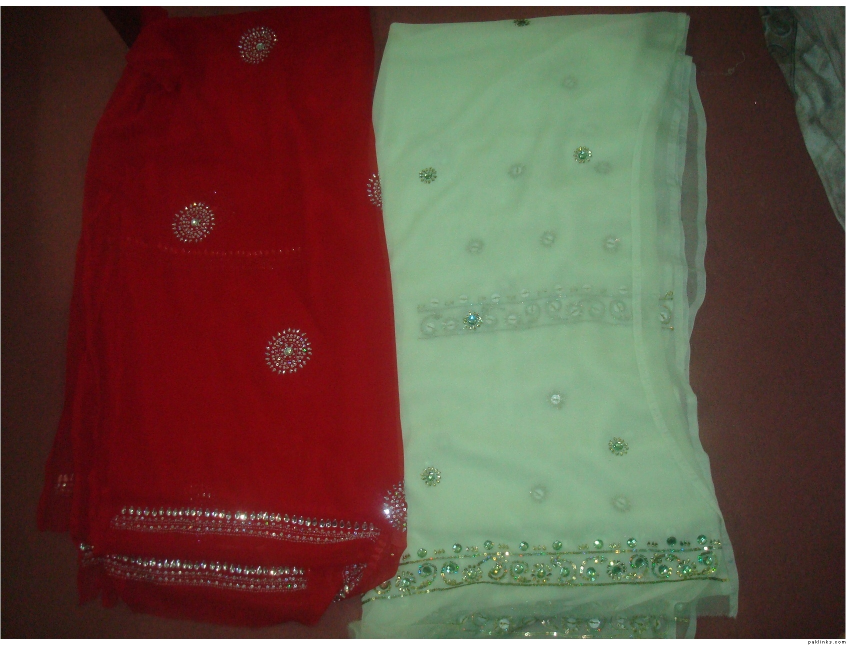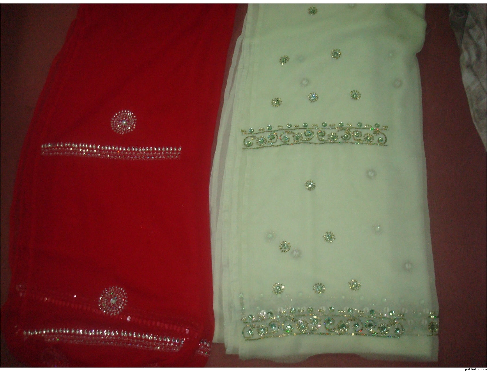 the red one has all kundan and sequins kaam mainly whereas the green one has stones,kundan,beads and sequins kaam done.