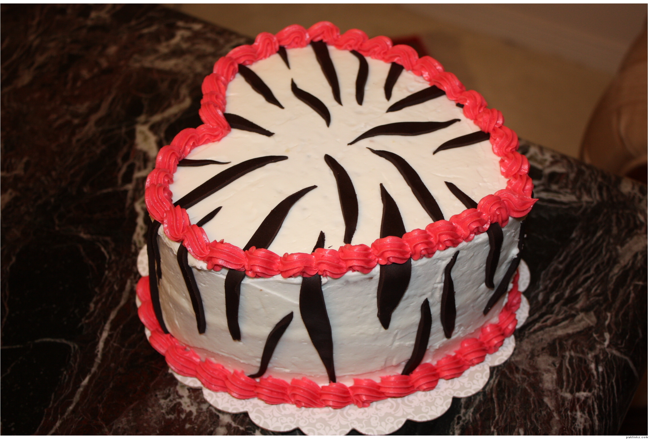 I was thinking, this cake would look great if I made a chocolate cake, covered it with chocolate fondant and put white zebra strips on it with the same colour border … hmmm, I will try that out some time in the future …