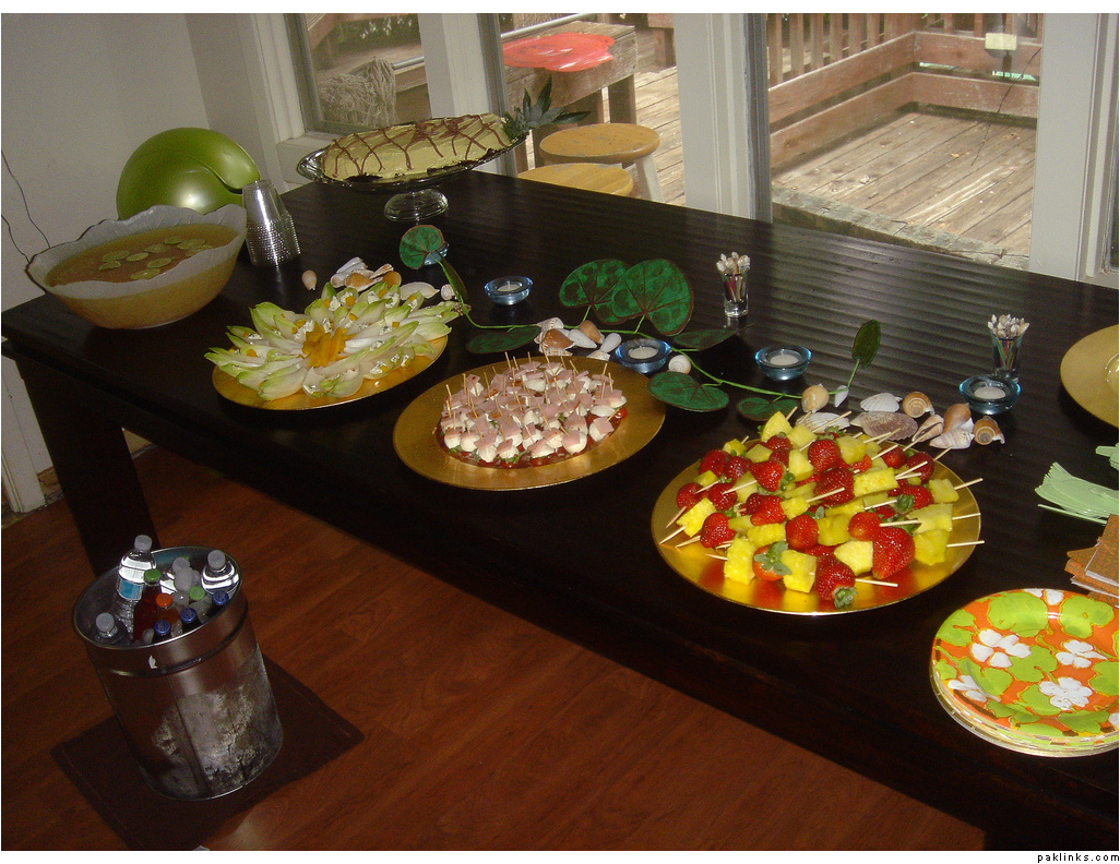 For the decoration part, use huge posters to create that sweet effect of a sunset on the beach, along with rubber palm trees, tropical fruit baskets, orchids, a couple of hammocks, grass shacks. And paint the words ‘Aloha’ on some old surfboard and put it at the door for added effect. Use stand up card board palm trees, Tiki torches and island grass garland and partitions.