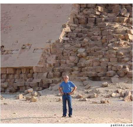 The picture shows Professor Michel Barsoum standing next to the Great Pyramid. He stress that these stones were poured into molds of clay! This what he proved in his researches after results of long experiments that these stones are not natural. Pro. Michel Barsoum confirmed after Electronic microscope analysis that they are a result of a quick interaction between clay, limestone and water at high temperatures.