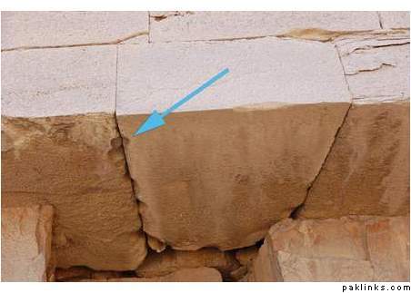 The picture shows two adjacent stones of the pyramid’s stones. We can notice the small oval cavity between them which is referred to by the arrow. It is a proof that the stones had been poured from mud in the rock template because this cavity was formed during casting stones, not as a result of erosion. It is originally out of these stones.
