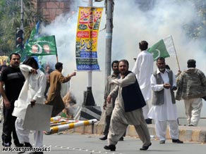 Officers in riot gear fired tear gas at the demonstrators near the Lahore Supreme Court. As soon as the sting from the gas wore off, the protesters regrouped, only to be chased away by police wielding batons.
